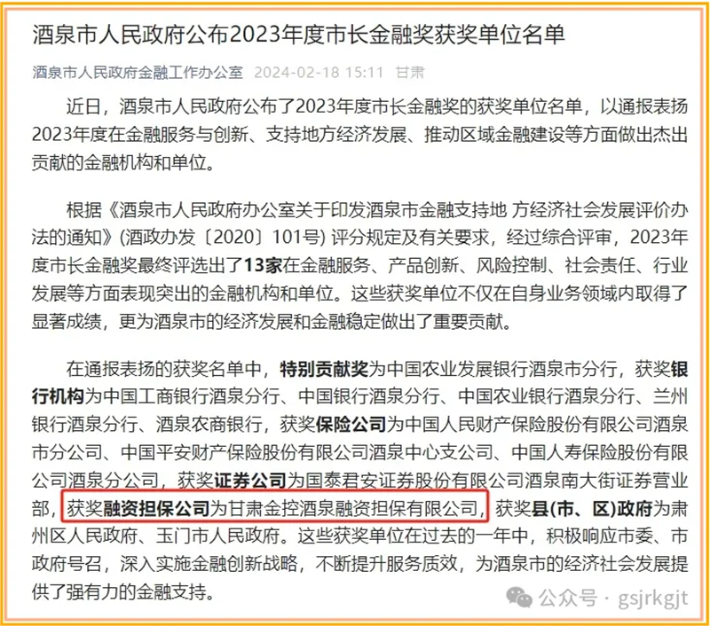 近日,酒泉市人民政府公布了2023年度市長金融獎的獲獎單位名單,通報表揚2023年度在金融服務與創新、支持地方經濟發展、推動區域金融建設等方面做出杰出貢獻的金融機構和單位,甘肅金控酒泉融資擔保有限公司榮獲酒泉市“2023年度市長金融獎”。